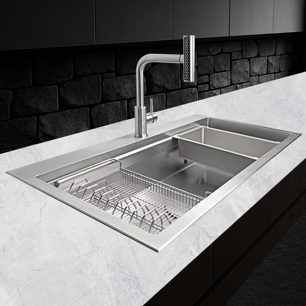 프로맘 엠보 사각 싱크볼 E858 수전 배수구 포함 9종 풀세트 나노코팅 싱크볼 교체 리폼